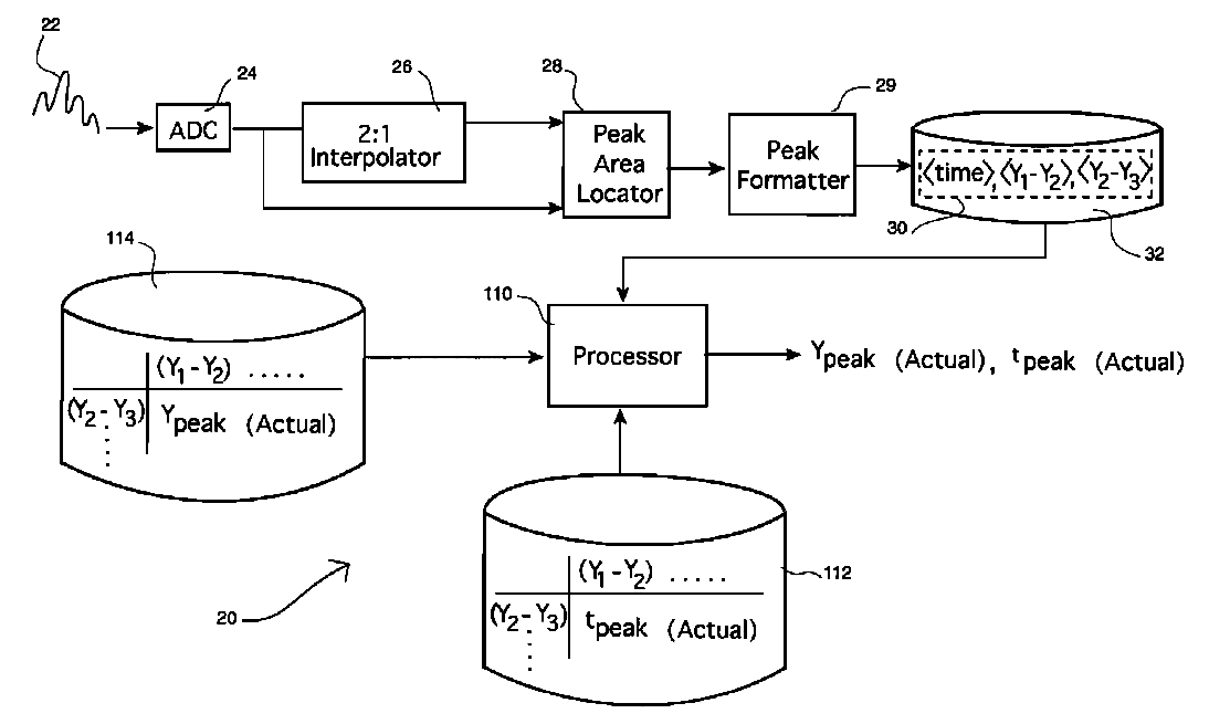 A method for determining the amplitude and time location of peaks in a digitized waveform. This method uses real-time polynomial curve-fitting to accurately determine the amplitude and position of the waveform peaks even if the peaks are located between the digitized samples. Optionally, it uses band-limited interpolation to further improve overall accuracy. This patent is used in the Design & Test Technology MeasureBoard series of instrumentation.